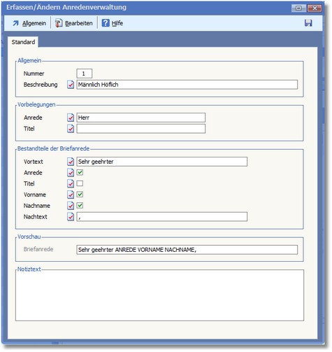 << Hier KLicken um eine Inhaltsübersicht anzuzeigen >> Navigation: CRM/OfficePlaner > Stammdaten > Adressstamm > Adressstamm - Menü > Anredenverwaltung > Anrede erfassen/ändern > Die Karteikarte "Standard" |