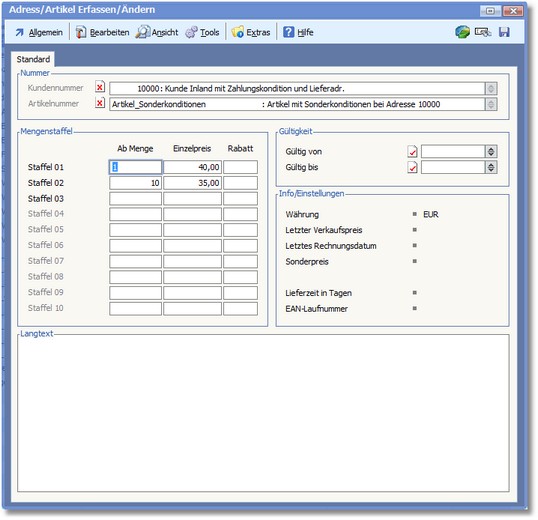 5. Erfassen Sie die Daten in den vorgesehenen Feldern und speichern Sie die neue Adress/Artikel-Kondition mit der Funktionstaste [F10].
