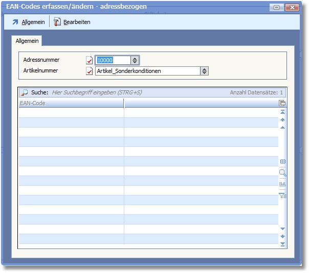 << Hier KLicken um eine Inhaltsübersicht anzuzeigen >> Navigation: Warenwirtschaft > Stammdaten > Konditionen > Adress/Artikel > Adress/Artikel bearbeiten - Menüleiste > EAN-Codes zuordnen |