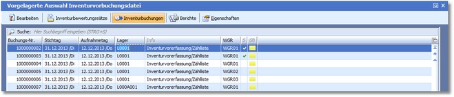 Ein Klick auf diesen Symbolbutton öffnet die Liste der Inventurbuchungen. Sie sehen hier alle Inventurbuchungen, die während der Inventur bereits durchgeführt wurden, auch wenn die verbuchten Zähllisten in der Inventurübersicht bereits gelöscht wurden.