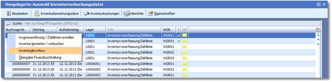 1. In der vorgelagerten Auswahl Inventurvorbuchungsdatei klicken Sie im Kontextmenü der rechten Maustaste auf den Menüpunkt "Inventurabschluss".
