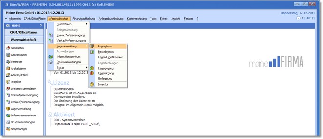 1. Klicken Sie mit der Maus im Hauptmenü auf  "Warenwirtschaft > Lagerverwaltung > Lagerstamm".
