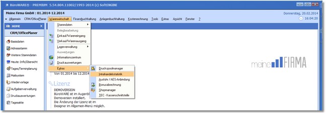1. Klicken Sie mit der Maus im Hauptmenü auf  "Warenwirtschaft > Extras > Intrahandelsstatistik".