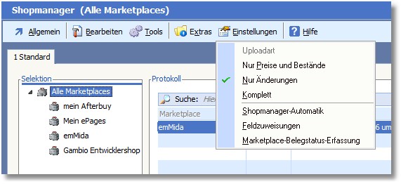 Über den Menüpunkt "Einstellungen" im Shopmanager kann konfiguriert werden, wie und welche Artikeldaten zum Marketplace übertragen werden sollen.