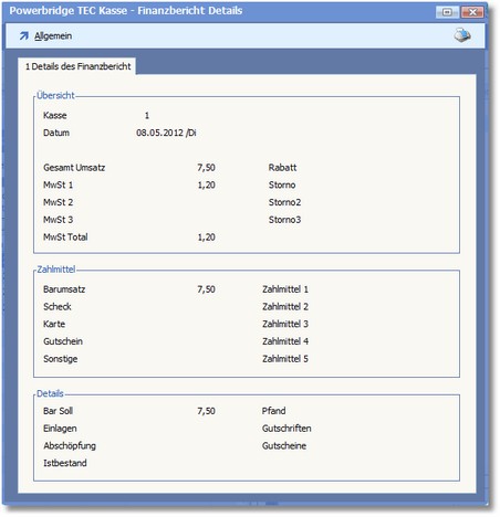<< Hier KLicken um eine Inhaltsübersicht anzuzeigen >> Navigation: BüroWARE Powerbridge > TEC-Kassenschnittstelle > Finanzbericht |
