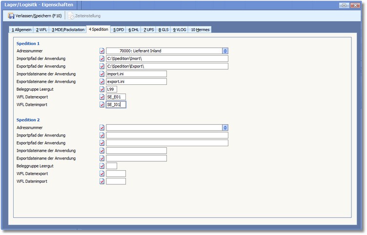 << Hier KLicken um eine Inhaltsübersicht anzuzeigen >> Navigation: Warenwirtschaft > Lagerverwaltung > Lager-/Logistikcenter > Liefersystem - Eigenschaften > Die Karteikarte "Spedition" |